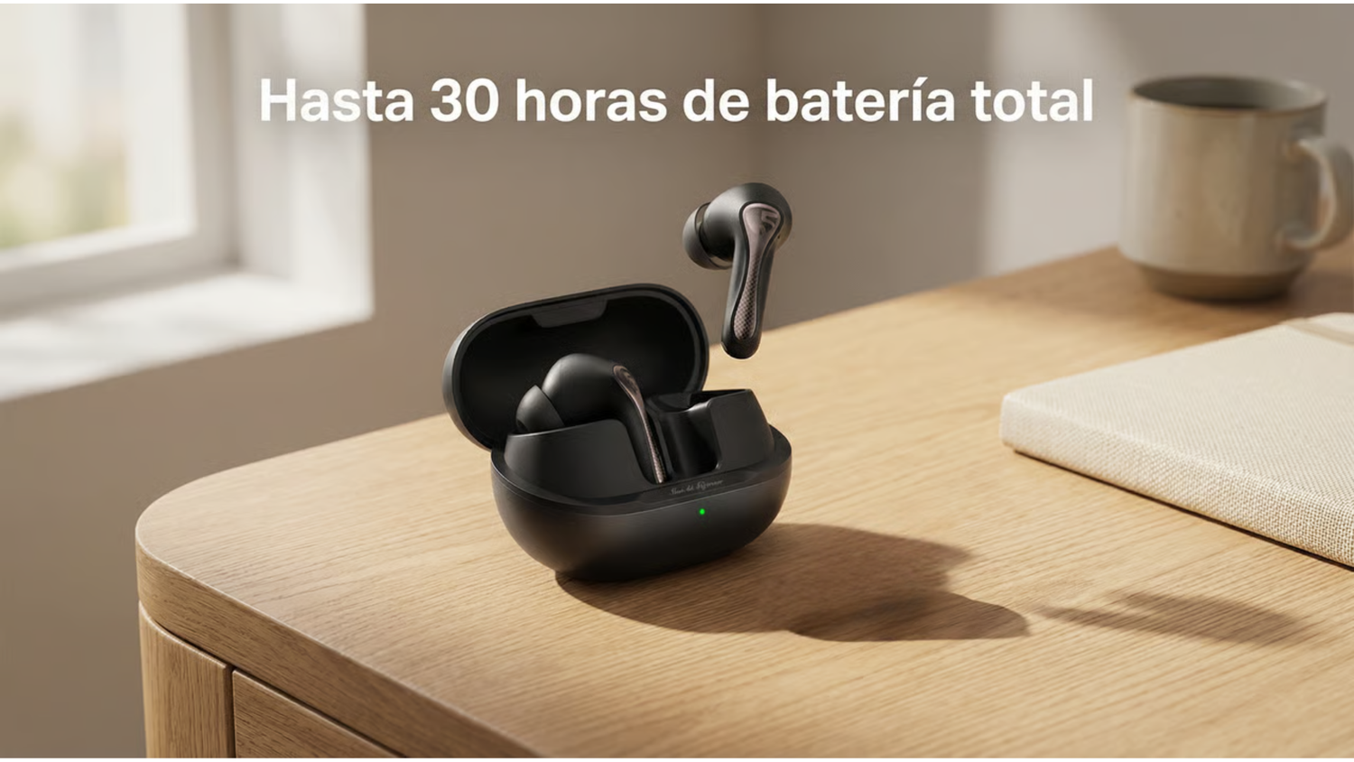 Hasta 6,5 horas de reproducción continua y hasta 30 horas de uso total con el estuche de carga, diseñados para acompañarte durante todo el día sin preocuparte por la batería.
