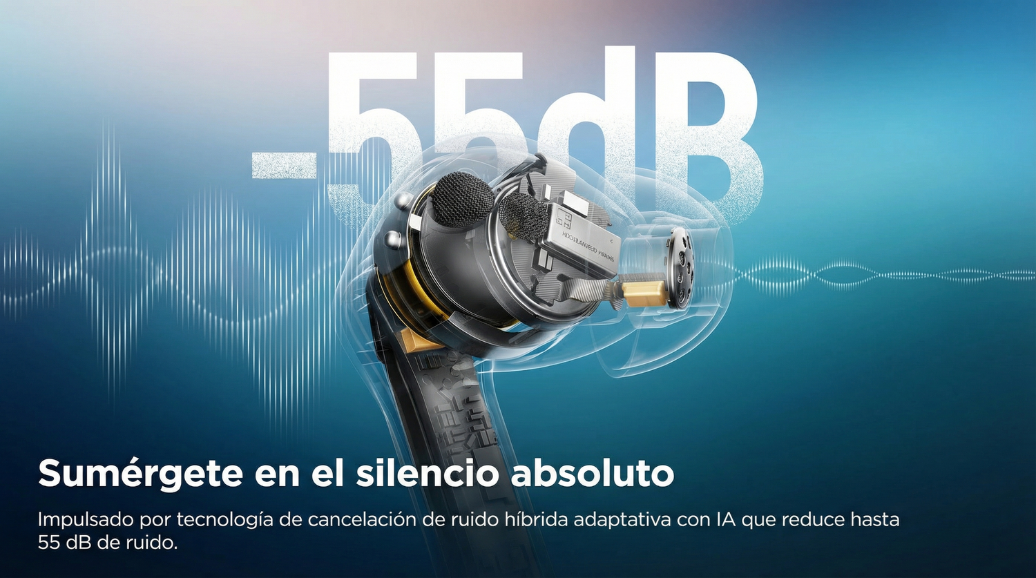 Tecnología de cancelación activa y ambiental que reduce el ruido del entorno, permitiendo disfrutar música y llamadas con mayor claridad, incluso en espacios ruidosos.