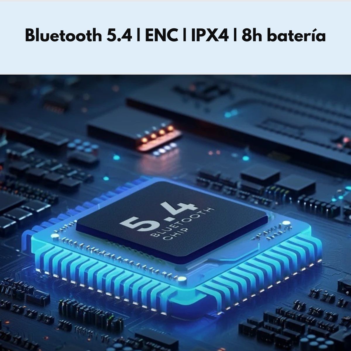 Equipados con Bluetooth 5.4 y cancelación de ruido ambiental (ENC), estos auriculares ofrecen una conexión estable y llamadas claras en cualquier situación. Su resistencia al agua IPX5 y batería de 160 mAh aseguran un rendimiento confiable durante 8 horas continuas.