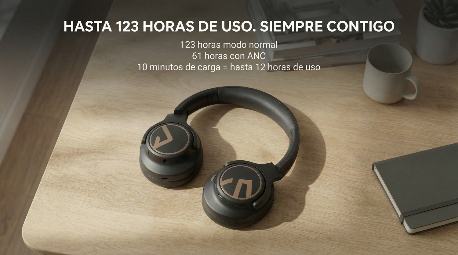 Hasta 123 horas de reproducción total, diseñados para acompañarte durante todo el día sin preocuparte por la carga.
