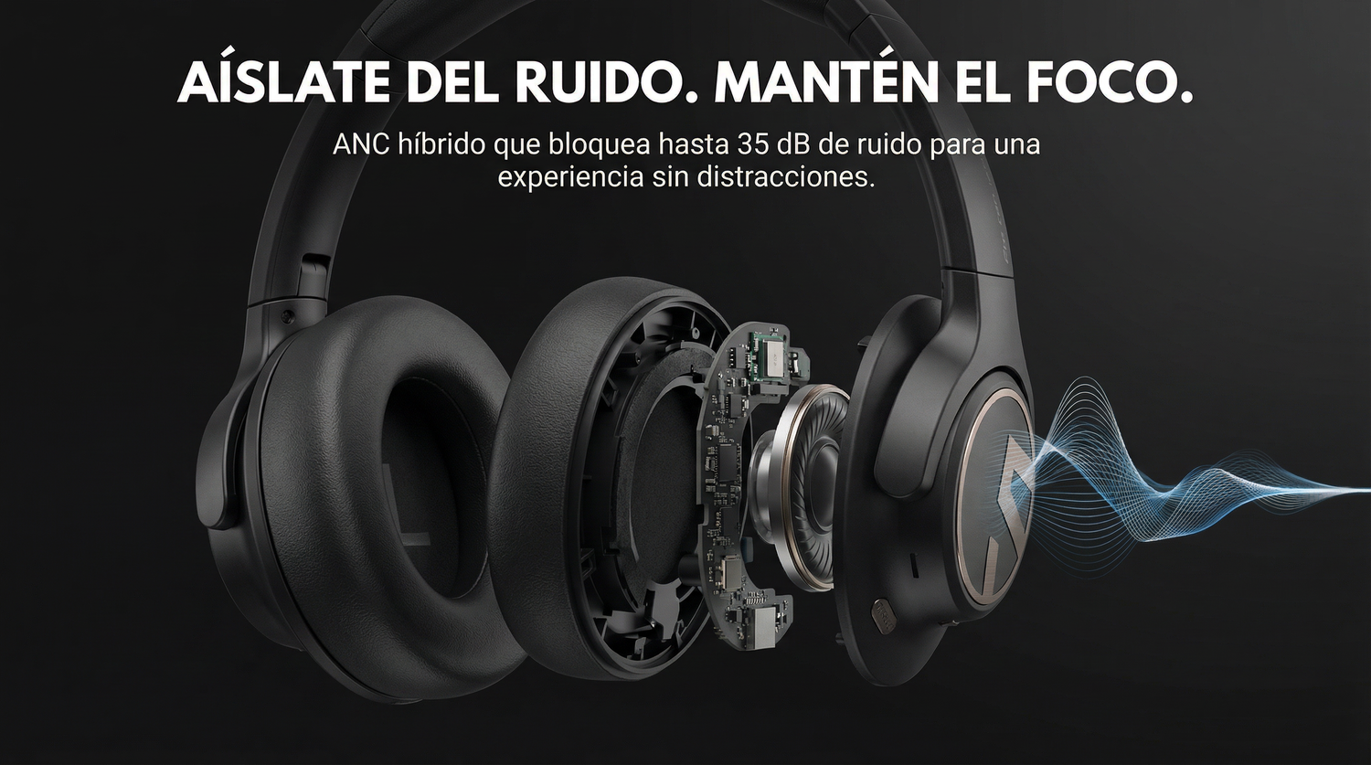 La tecnología ANC híbrida reduce hasta 35 dB de ruido exterior, permitiéndote concentrarte incluso en entornos exigentes. El sonido es claro, potente y equilibrado, pensado para sesiones largas sin fatiga auditiva.