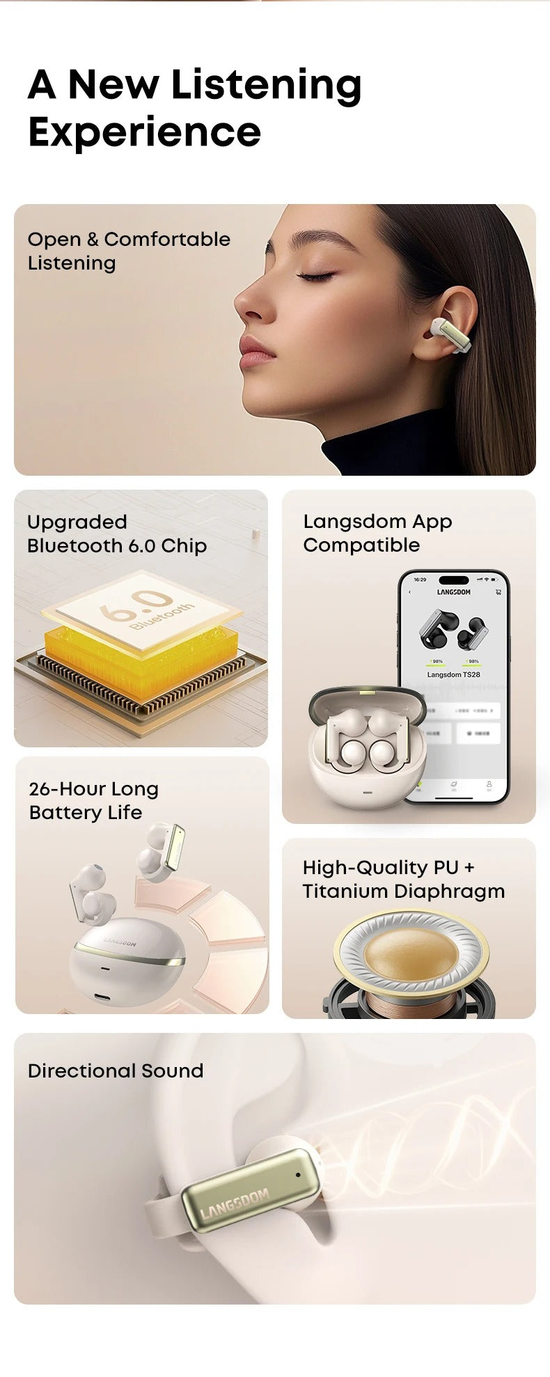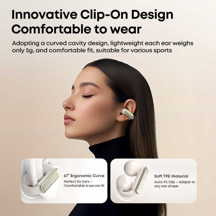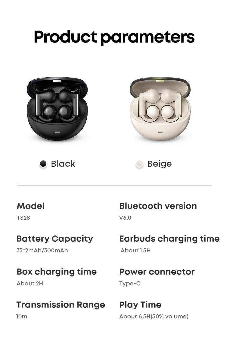 Los Langsdom TS28 son auriculares deportivos con diseño de oreja-clip, pensados para entregarte libertad de movimiento y calidad sonora sin perder conexión con tu entorno. Equipados con Bluetooth 6.0, control táctil y por app, cancelación de ruido ambiental (ENC) y batería de larga duración, son ideales para actividades al aire libre, gimnasio o uso diario.
