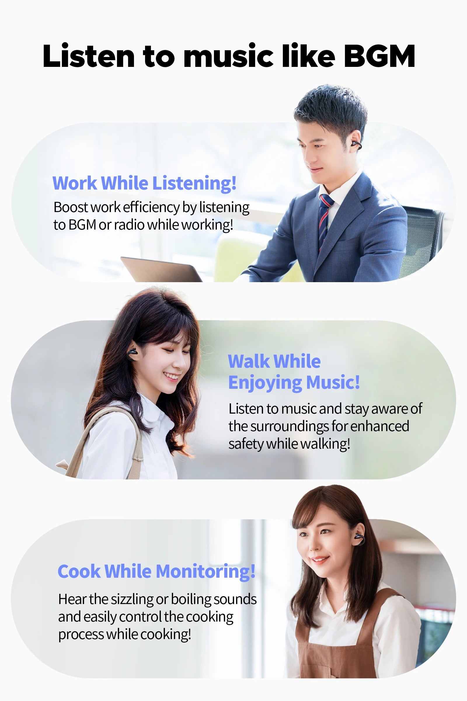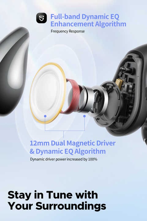 Diseño Abierto y Ergonómico: El diseño clip-on abierto permite una mayor conciencia del entorno mientras disfrutas de tu música favorita, brindando seguridad durante actividades al aire libre.